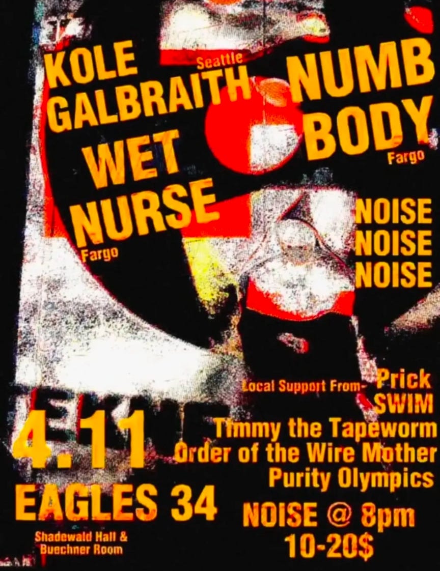 Supporting three touring acts (Seattle’s Kole Galbraith, Fargo’s Wet Nurse and Numb Body), purity olympics will be performing a duo set (aly + James) alongside the Order, James Allen’s Timmy the Tapeworm, and fellow locals SWIM and Prick.